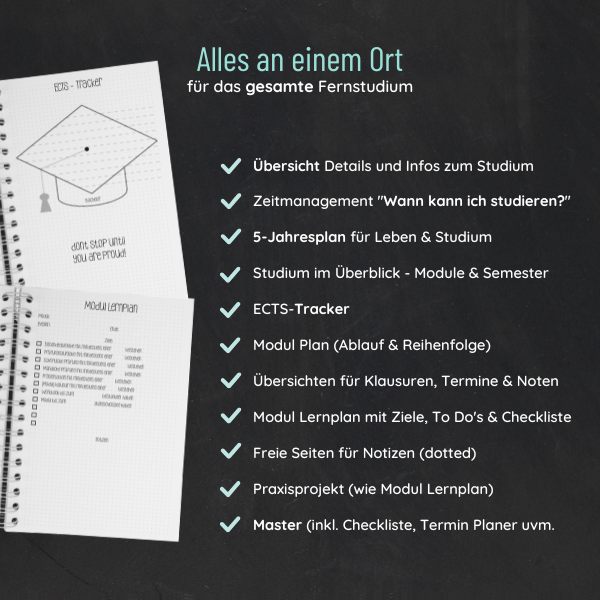 Der Fernuni Planer Master Classic in der Original Schriftart begleitet dich durch dein komplettes Fernstudium. Von den ersten Modulen bis zum Abschluss. Flexibel anpassbar an jedes Zeitmodell und der Modulanzahl, bietet er klare Strukturen, viel Raum für deine Planung und ein durchdachtes System für langfristigen Fortschritt