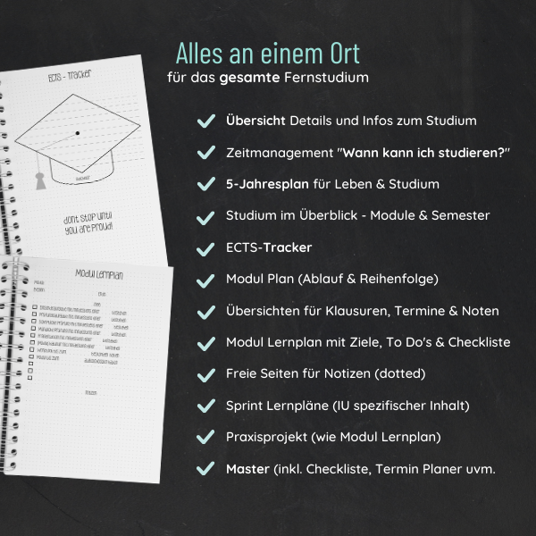 Der spiralgebundene Fernuni Planer IU Edition begleitet dich von deinem ersten Modul bis zum Abschluss. Er wurde speziell für die Anforderungen eines Masterstudiums an der IU entwickelt und bietet dir eine klare Struktur, maximale Flexibilität und genug Raum für deine eigene Planungsweise.